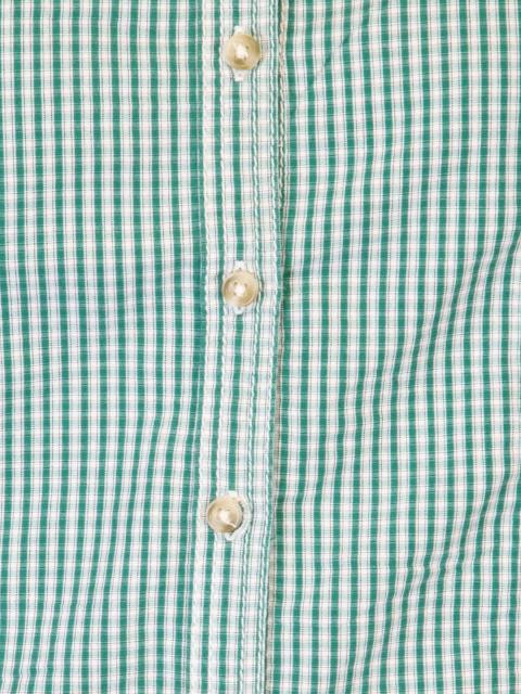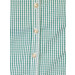 Green check shirt, has full length buttoned placket, three quarter sleeves with button tabs and a curved hem