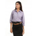 Purple and white shirt, has three quarter sleeves with buttoned cuffs, open spread collar without a top button, full buttoned placket with tipping and a curved hemline