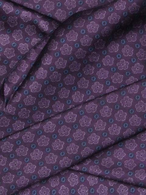 Purple shirt with dark purple check lines made of 100% cotton, with full length sleeves that have a buttoned hem, front buttoned placket with a silk inner placket lining and tipped collar with a silk inseam in the same design as the scarf.Purple scarf made of silk with floral print