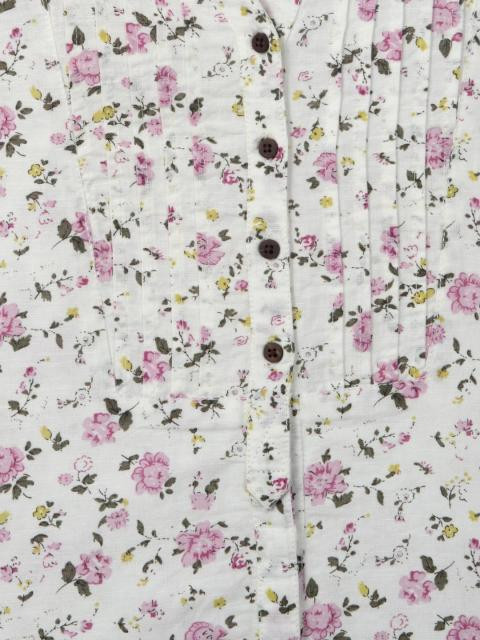 White shirt with pink printed floral designs, open collar with pin tucks and a full buttoned placket, hidden at the bottom half, long sleeves with buttoned cuffs.
