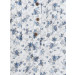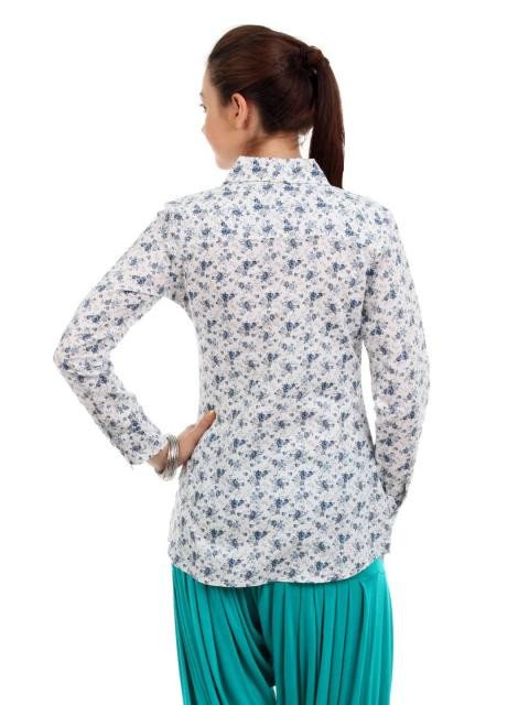 White shirt with blue printed floral designs, open collar with pin tucks and a full buttoned placket, hidden at the bottom half, long sleeves with buttoned cuffs