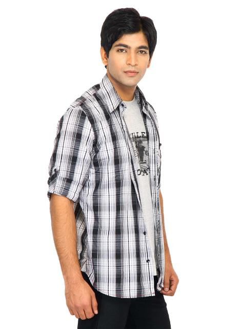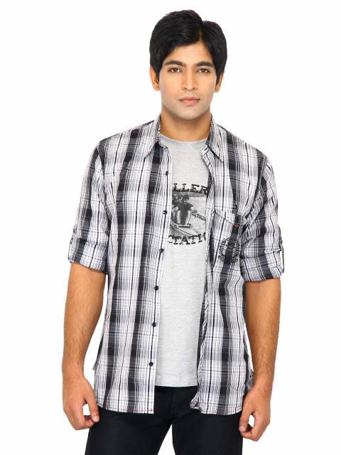When it's Thursday and you want to wear something that's not formal, but not casual either, try this semi-formal checked shirt from scullers. For a spunky look wear the shirt unbuttoned, showing off the attached grey vest. Wear it buttoned up for a chic, cool look. Pair it with denims or corduroys and walk in style.