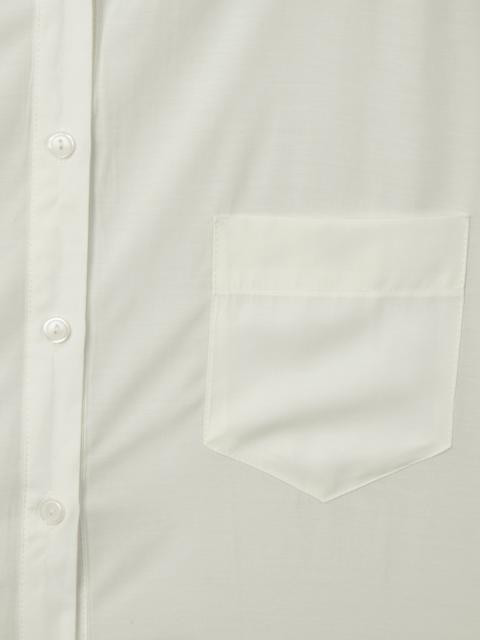 White shirt with a spread collar, buttoned placket at the front, yoke at the back, long sleeves with buttoned cuffs and a button tab, curved hem