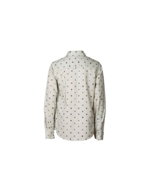 White shirt, has a spread collar, long sleeves with buttoned cuffs, full buttoned placket, print and a curved hem