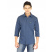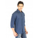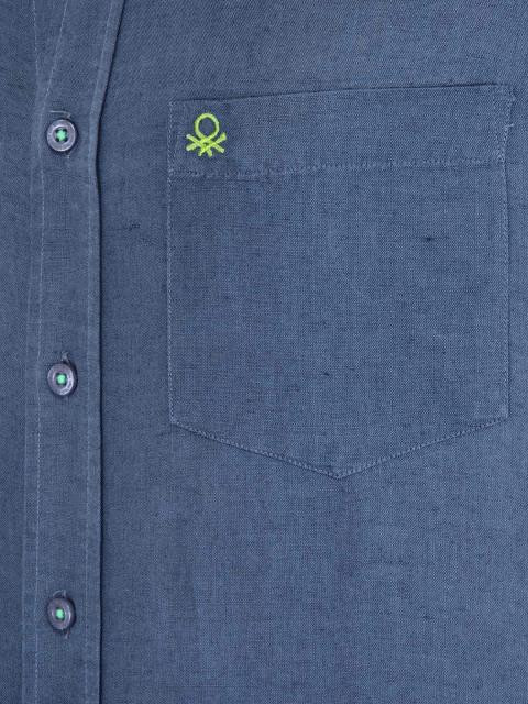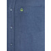 Peacock blue shirt made of 100% cotton, has a buttoned placket, green twill tape detailing on inseam of the collar, full arms with buttoned cuffs, patch pocket on the left chest with an embroidered  Big Ben motif and a curved hem