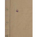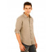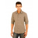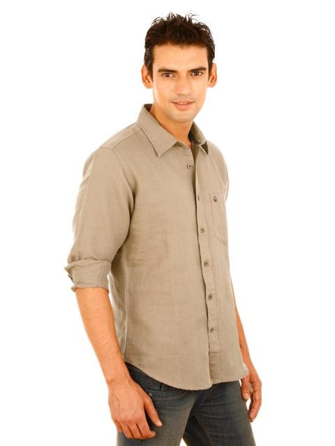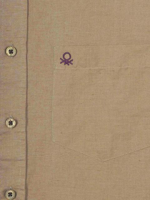Light brown full-sleeve shirt made of 67% linen and 33% cotton, has tape detailing on the inseam of the collar, patch pocket on the left chest with embroidered logo, full length buttoned placket and a curved hemline