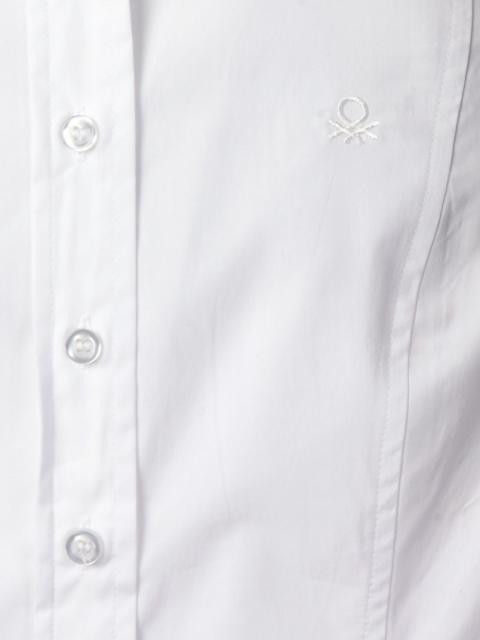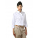 White shirt, has three quarter sleeves with buttoned cuffs, stand-up collar with buttoned front placket and a curved hem