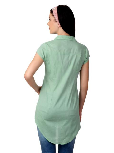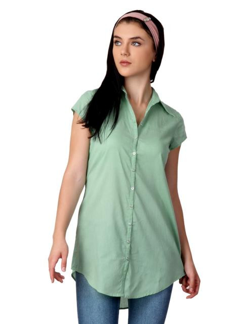 Green shirt with weave details, collar with a full buttoned placket on the front, cap sleeves, yoke at the front and back and curved hem