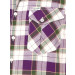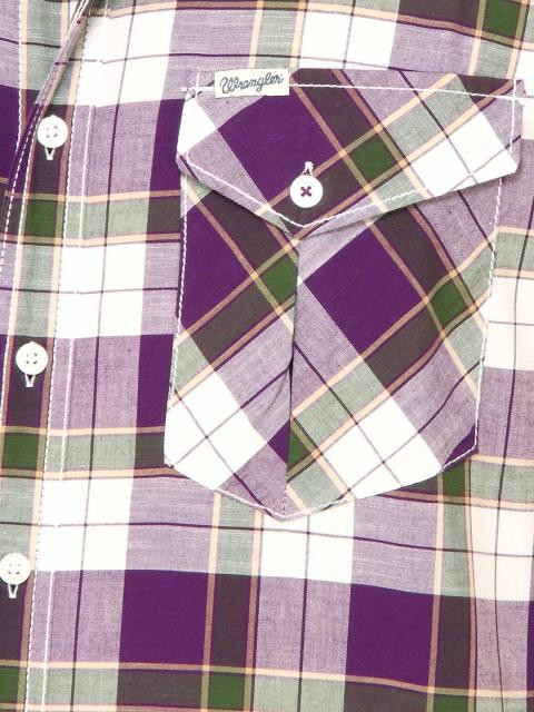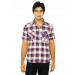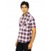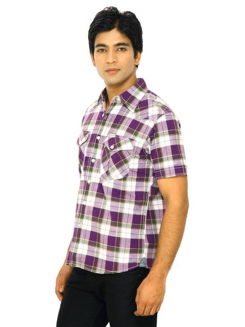 Purple and white check shirt made of 100% cotton, has a tipped collar with a full front button placket, short sleeves, two buttoned flap pockets on either chest with brand badge on the left one, stitch detailing and has a curved hemline
