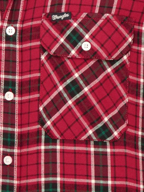Red, black, green and white check shirt made of 100% cotton, has a tipped collar with a full front button placket, full hand cuff sleeves with mid-sleeve buttoned flap, buttoned flap pocket on left chest with brand badge and has a curved hemline