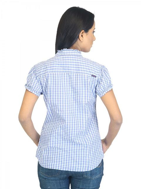 This stylish shirt with its bright checks is kept feminine with elasticated sleeves and a slim collar, while the cotton fabric keeps you fresh and comfortable all day. Team this with jeans and leather shoes for a cowgirl look.