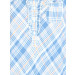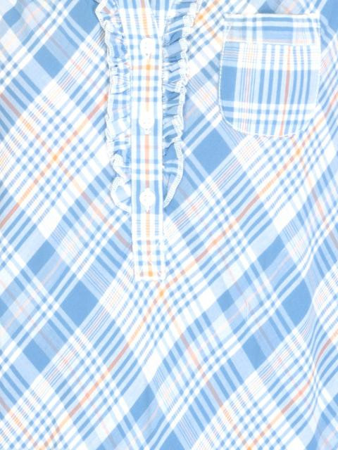 Blue and white check shirt made of 100% cotton, has a spread collar with ruffles, a split neckline, a half buttoned placket with ruffles, long sleeves with buttoned cuffs and a mid arm button tab, a patch pocket on the left chest and a curved hem