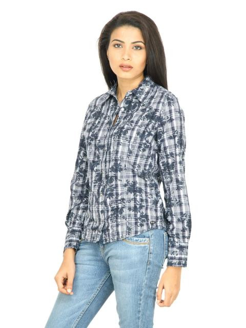 Black and grey checked shirt made of 100% cotton, has a slim spread collar, a full front buttoned placket, long sleeves with buttoned cuffs, buttoned epaulettes on shoulders, Western style yoked back and front, seam lines for Fit on front and back, mock welt pockets on chest and a curved hem
