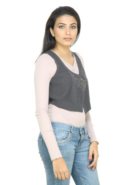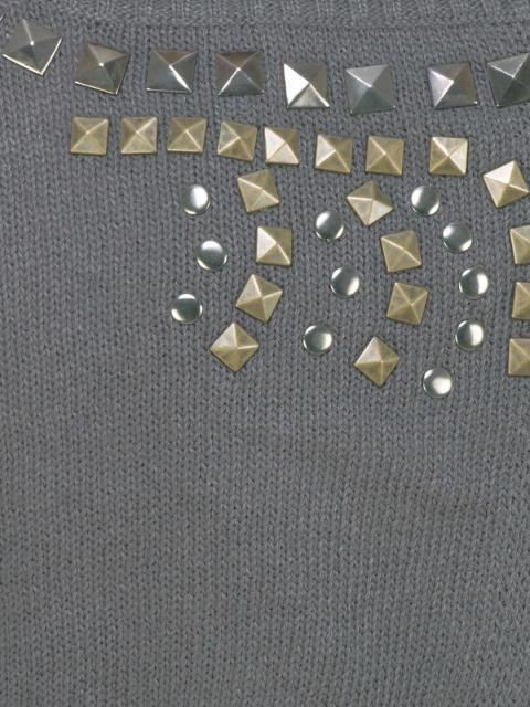 Grey sleeveless top made of 50% wool and 50% acrylic, has metal stud embellishments on the front and cut-out patterning at the back