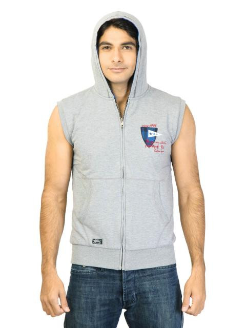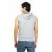 Grey reversible sleeveless hooded sweatshirt with the reversible side in blue and black checks, made of 100% cotton, has a full front zipper, applique and embroidered branding on the left chest of the grey side, black tipping along the armholes and hem on the blue side, pockets on the waist of either side, and a ribbed hem