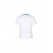 White and blue round neck t-shirt, has short sleeves, graphic print on the front and stitch detailing