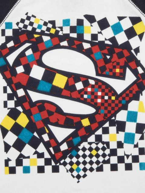 Off-white and navy blue top, has a round neck, short sleeves and superman graphic print on the front