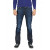 Indigo blue flat knit pullover made of 77% cotton, 20% nylon and 3% spandex, has a V-neckline, long sleeves with ribbed cuffs, ribbed hemline and embroidered brand logo on the upper left chest