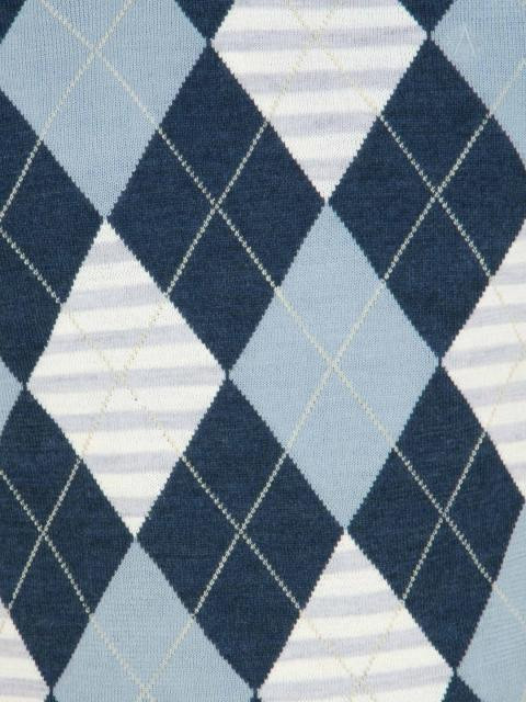 Blue sleeveless V-neck sweater with a navy blue and white diamond design, has a ribbed neck, armholes and hem