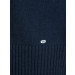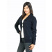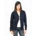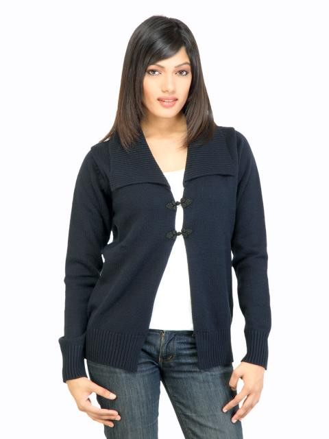 Navy cardigan made of 80% acrylic and 20% wool, has long sleeves, large fold-over ribbed collar, buttoned with two decorative black cord toggles at front, ribbed cuffs and hemline and small metal logo on lower front