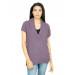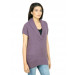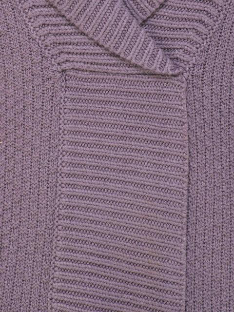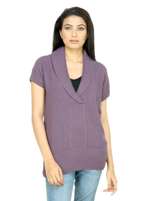Purple shawl neck sweater with low cut V-neckline, made of 60% cotton and 40% acrylic, has short sleeves with ribbed cuffs and a ribbed hem