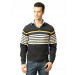 Grey and cream striped V-neck sweater made of 100% cotton, has full sleeves with ribbed cuffs, ribbing around the neck and hemline, and branding appliquéd above the hemline