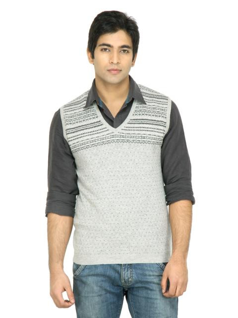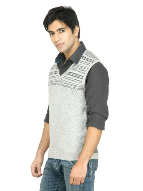 Grey V-neck sweater made of 80% lambswool and 20% nylon, has ribbed arm holes, neck line and hem with all over patterning