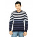 Blue and cream V-neck sweater made of 80% lambswool and 20% nylon, has full sleeves with ribbed cuffs and a ribbed hem