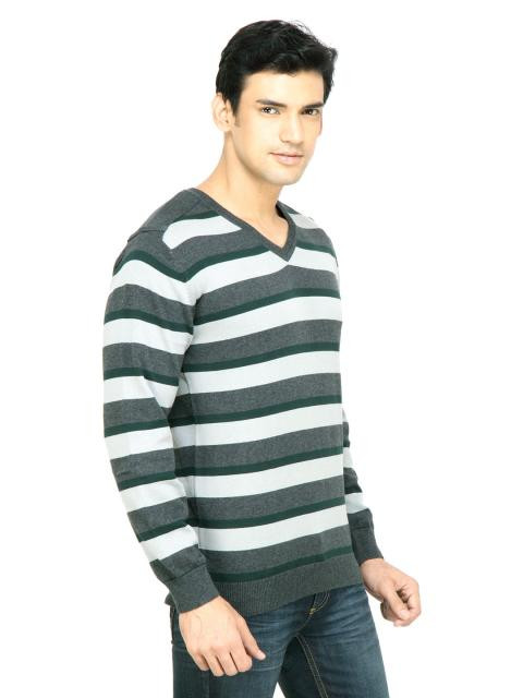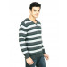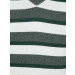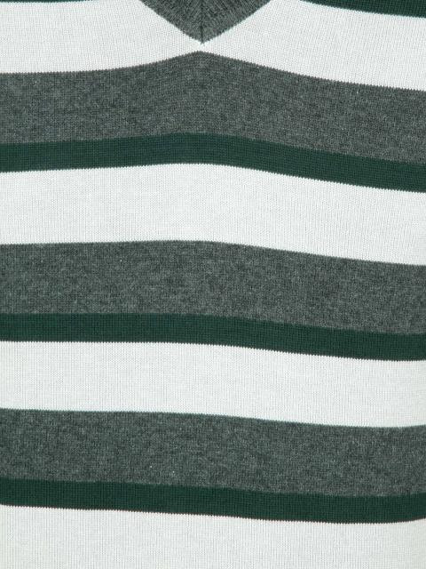 Green and grey striped sweater made of 100% cotton, has a ribbed V-neck, long sleeves with ribbed cuffs and a ribbed hem