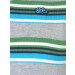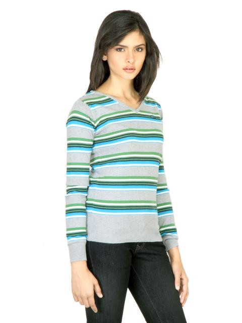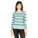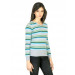Aqua blue sweater with multi-coloured stripes, made of a cotton/nylon blend, has a ribbed V-neck, long sleeves with ribbed cuffs, a broad ribbed hem and brand badge appliquéd on the left chest