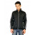 Black printed sweatshirt made of 80% cotton and 20% polyester, has full sleeves with ribbed cuffs, a ribbed hem, zippered chest placket with mock collar, two kangaroo pockets with stitch detailing and graphic print on the front