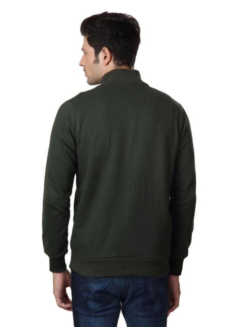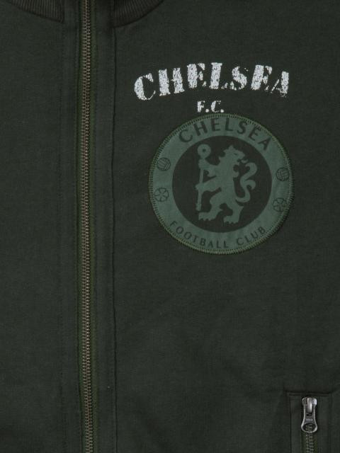Olive green sweatshirt with a rib knit neck, mock collar with zippered front, Chelsea logo appliqued on the left chest, zipped pockets on the front on both sides, brand logo on the right bottom, long sleeves with ribbed cuffs and a ribbed hem