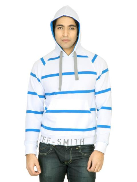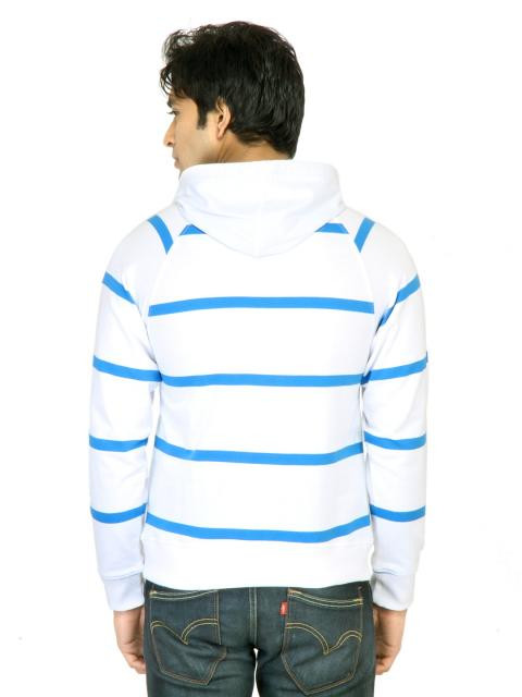 White sweatshirt with canary blue stripes made of 100% cotton, has long raglan sleeves with ribbed cuffs, lined hood with chunky drawcords, pouch pocket on front and ribbed hem with printed branding