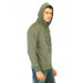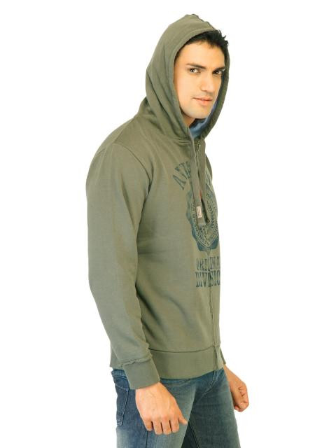 Khaki green jacket made of 100% cotton, has long sleeves with ribbed cuffs, hood with drawstring, zippered closure on the front with snipped edges, distressed look graphic of aviation department on the front, aapliqued patch on the lower back with distressed look print and rugged edges, and a ribbed hemline