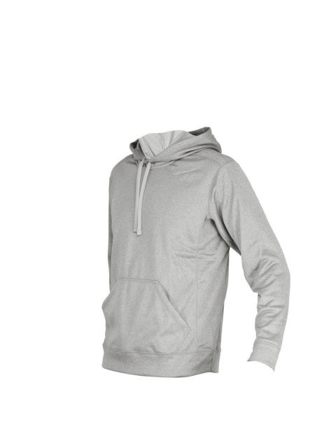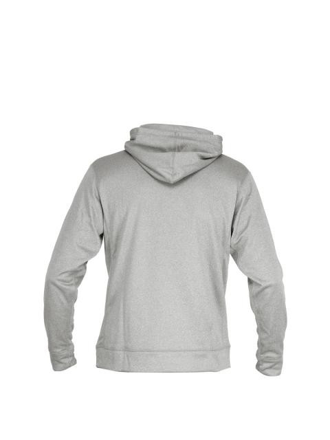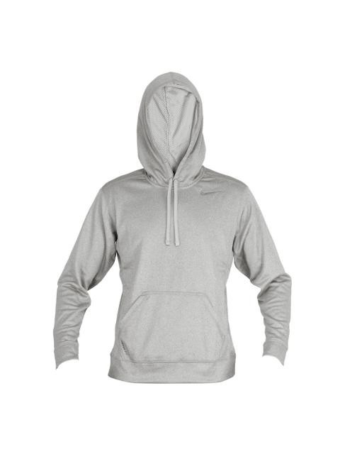 Grey jacket made of 100% polyester, has a hood with drawstrings, long raglan sleeves, Therma-Fit technology, two insert pockets on the sides and nike swoosh printed on the left chest
