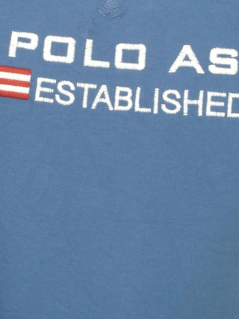 Blue sweatshirt made of 100% cotton, has a round ribbed collar, v-shaped stitch detail at neckline, long raglan sleeves with ribbed cuffs, appliquéd and embroidered branding on the chest and a ribbed hem