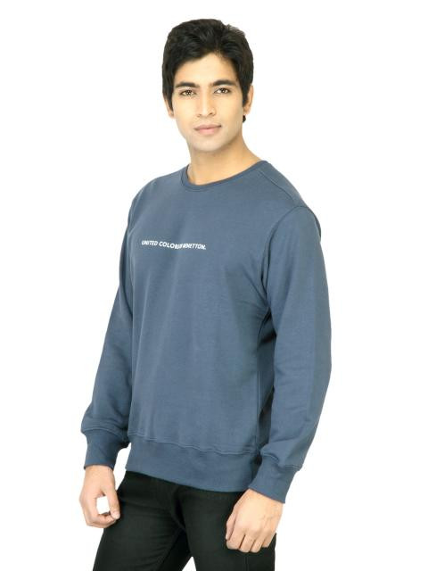 Blue sweatshirt made of 100% cotton, has full sleeves with ribbed cuffs, printed branding on the chest and a ribbed hem