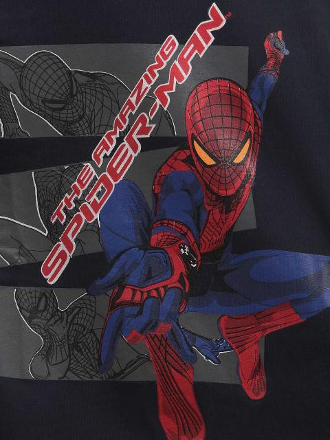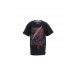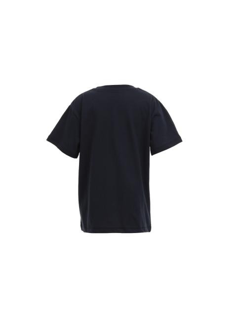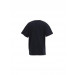 Navy blue round neck t-shirt, has short sleeves, graphic print on the front, rib knit binding at neck, printed branding for tagless comfort, flatlock stitch at sleeve and bottom hem
