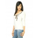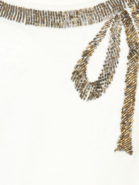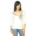 White round neck T-shirt made of 95% viscose cotton and 5% lycra, has long puffed sleeves and embellishments