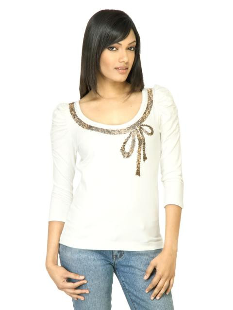 arrow woman caters to fashionistas with a taste for the exotic. This T-shirt is a glamourised version of the typical tee with its slim silhouette and puff sleeves. Pair it with richly hued denims, sky high heels and a scarf.