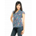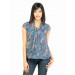 Blue V-neck top made of 100% polyester, has cap sleeves, a tieable bow at the neck, a concealed zipper below the left arm and an elasticated hem