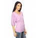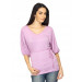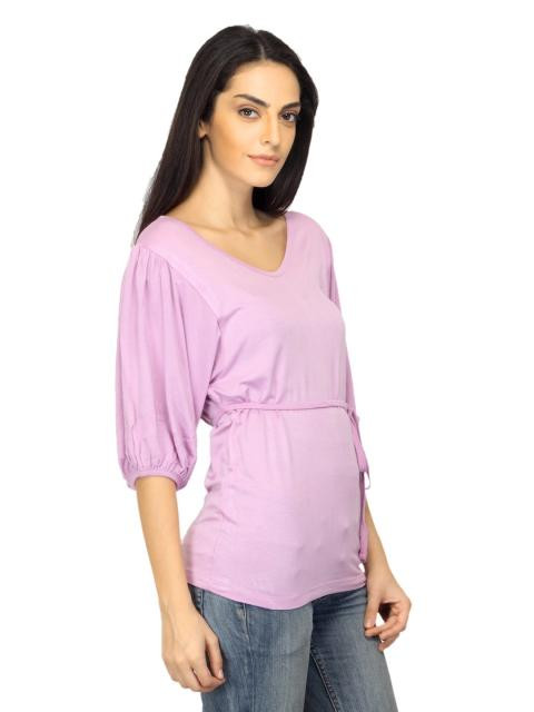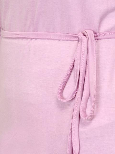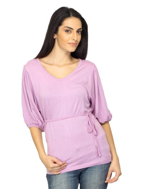 Lavender scooped neck top made of 100% viscose, has bishop sleeves, sash to tie around the waist and crystal embellishments above the hem