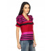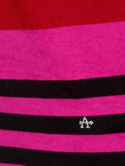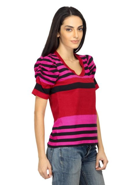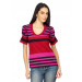 Hot pink, red and black striped round neck top, has short puffed sleeves with ruching, crystal embellishment on the left hem