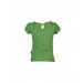 Green round neck top made of 100% cotton, has short puffed sleeves, ruched neckline and netted floral embellishment on the left side of the neckline