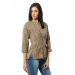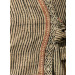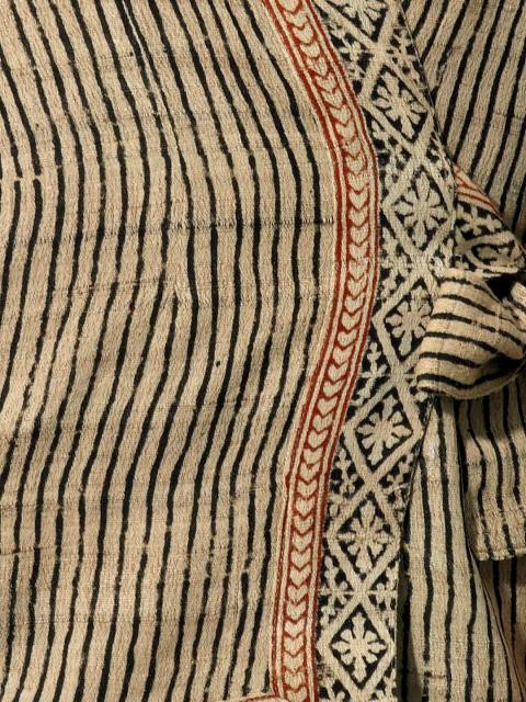 Beige and black printed wrap top made of ghicha silk, has three quarter sleeves, mandarin collar, wrap around fastenings with a sash, a vented hem and vented cuffs