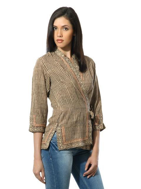 This feminine wrap top with pretty fastenings by fabindia is a perfect top to wear with your favourite jeans, or as a useful top layer over ethnic ensembles. Ghicha silk has a unique, slightly rough, texture - and when combined with the charming imperfections of the block printing (which has all been done by hand) and the fashionable cut, the end result is a one-of-a-kind piece which is sure to become a well-loved favourite. So go all out and make an Indo-Western statement by pairing this top with simple form fitting denims and sandals.