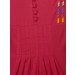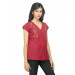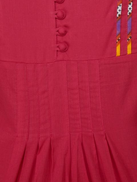 Red cambric top made of a cotton fabric, has a V-neck, short sleeves, pin-tucks on the front and a buttoned chest placket