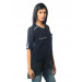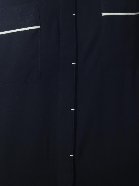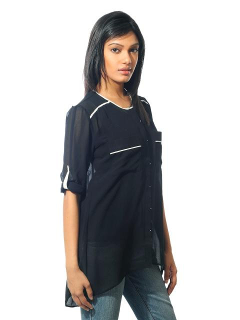 Black sheer shirt made of a blended fabric with a soft drape, has a round neck, full buttoned placket, two patch pockets on the chest, three quarter sleeves, concealed buttoned placket and a dropped hem at the back