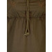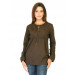 Brown top made, has a keyhole neck with a tie up tassle, empire waist with embroidery on the chest, mildly pleated, and has long sleeves with ruching