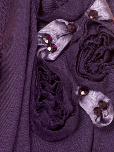 Purple blouson top made of 100% cotton, has a cowl neck, fabric trims as roses above the left chest, and an elasticated hem